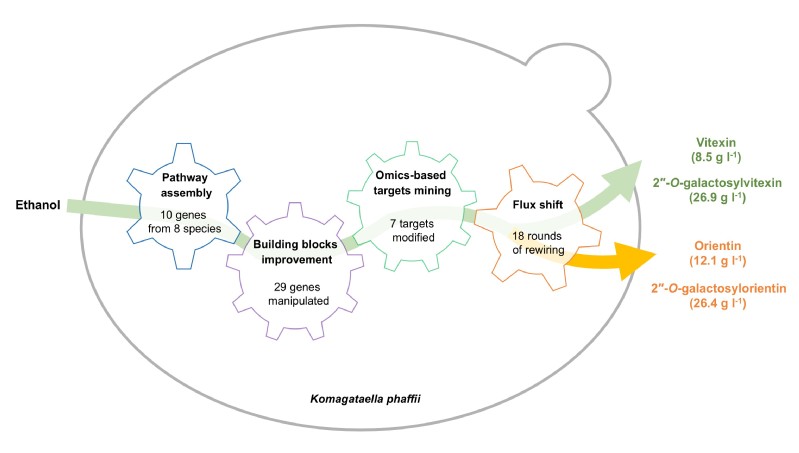 针对平行竞争途径中荭草素合成效率极低的问题,研究团队通过探究高特异性酶、多酶融合体、多酶表达精细控制等多重组合策略,成功实现有效的“代谢引流”,获得荭草素及2″-O-荭草素半乳糖苷的高产菌株。