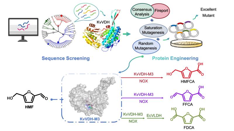 发酵工业分离提取技术研发中心在双功能HMF氧化酶的挖掘和蛋白质工程改造以及FDCA的高效生物制造方向取得的创新研究成果,论文题目为“Novel iterative genome mining and engineering of a bifunctional KvVDH enable selective production of furan carboxylic acids from high-concentration 5-hydroxymethylfurfural”。该研究建立了高效、高选择性的生物催化平台,为将高浓度HMF选择性转化为各增值呋喃羧酸提供了一种有前途的方法。