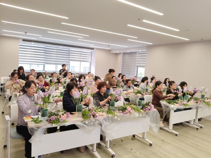 活动特邀专业花艺教师现场授课。花艺教师从花材识别、色彩搭配到造型设计,深入浅出地讲解了插花的基础知识与实用技巧。在随后的插花创作环节,老师们兴致盎然,精心挑选花材,修剪枝叶、构思层次、搭配色彩,将一朵朵鲜花错落有致地插入花瓶中。现场花香四溢,气氛温馨愉悦,大家在动手创作中放松身心,于花木间感受自然之美,在巧思中体验艺术之趣。